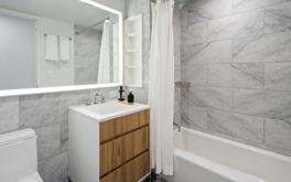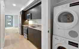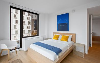 Studio with terrace, floor-to-ceiling windows and custom blinds, in-unit Bosch washer and dryer, and Grohe bathroom finishes. Kitchen features include stainless steel appliances and quartzite countertops.