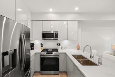 - Crisp white kitchen cabinetry paired with warm beige floors for a fresh, inviting finish