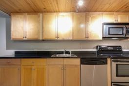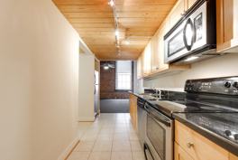 This studio apartment features brick accent walls, tall ceilings, a Huge walk-in closet, loft storage space, lots of natural light and a large open kitchen.