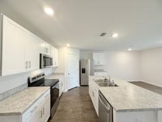 The spacious, open-concept kitchen offers an abundance of counter space, a generous island with bar seating, and stainless steel appliances, including a double door refrigerator, flat top range/oven, built-in microwave, and a dishwasher. The primary suite includes a ceiling fan, walk-in closet, and an ensuite bathroom with private water closet, standing shower and double vanity. Three additional bedrooms share a second full bath with tub/shower combo.
