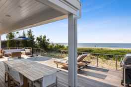 Rental Reg. # 23-719 Offered for the first time. Stunning new construction directly on Gardiners Bay beach front. Sparkling bright interiors and high end, clean finishes and furnishings throughout. Main level has a large open concept living/ dining and kitchen, office/ den with full bath, another 1/2 bath and laundry and a custom built in bar with wine fridge. Floor to ceiling custom doors open to a massive back deck with Restoration Hardware furniture, gas and charcoal grills and outdoor shower. Step off the deck into the sand and to the path leading to the beach. Upstairs is a huge gallery landing with floor to ceiling doors leading to a large deck on the front overlooking Three Mile Harbor and Sammy's Beach Preserve and an even larger deck on the back looking out to Gardiners Bay, The North Fork, Shelter Island and Gardiners Island. Three ensuite bedrooms complete this level, all with beautiful marble baths and walk-in closets and the master with access to the bay view deck. Finished lower level has a large media/ game room, pool table, Peloton, separate sleeping accommodations, a full bath and another laundry room. Kayaks, paddle boards and surf boards available to tenants. Truly spectacular home and unrivaled setting and views. Listing ID: 878838