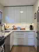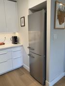 Kitchen features new cabinets and quartz countertops, LED lighting, new sink and faucet, new ceramic top stove, Miele stainless fridge, full-sized stainless Miele dishwasher and microwave. Additional countertop under window for a computer workspace or eating space.