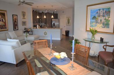 This apartment is perfect for the professional coming to Charleston to work on a project, a med student doing a rotation, a couple vacationing for the summer. Don't let the one bedroom fool you. This apartment is open, cheerful, full of amenities and space galore. Walk in the front door and you are greeted with an open kitchen looking out into the elegant living room, dining room and private patio. Originally, a two bedroom, the guest space has been turned into a den/office equipped with a sleeper sofa for guests. Lots of storage in this apartment along with two full baths. Enjoy time on the patio for your morning cup of joe or a glass of wine in the afternoon overlooking the bocce ball court. That's right...bocce ball. It also has a saltwater pool with community grills and fire pit. Inside the shared community space you will find a full kitchen, pool tables, coffee station, gym, YOGA room and plenty of space to hang out with your new neighbors. Summer rental May 15th-Oct 15.