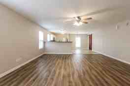 Inside, the living room spans the center of the home, finished with LVP flooring, recessed lighting, and a ceiling fan that complements the room’s scale. The space opens naturally toward the dining area and kitchen, creating a continuous layout suited for both daily routines and casual gatherings. The kitchen features tile flooring, white cabinetry, expansive countertops, stainless steel appliances, and a peninsula-style counter that adds prep space while maintaining sightlines to the living area.