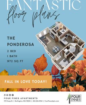 Find yourself at home next to Burlington Crossings just north of the Skagit River. This is the land of tulips, stunning views, canoes, and mountain day hikes…just on a whim. Commuters are close to I-5 and just a short walk to public transportation for travel to Seattle, Bellevue, or Bellingham. Highway 20 feeds the real passions of northwest enthusiasts. This two-lane arterial connects to the San Juan Islands and Deception Pass to the west, or to Mount Baker and the blue-green glacial waters of Lake Diablo and Ross Lake to the east. Meanwhile, our beautiful homes are spacious, and include open floorplans, modern finishes and appliances, gigabit internet, and washers and dryers in every residence…with off-street parking. The lobby is welcoming for your guests and parking is available for them as well. The entire building is pet-friendly, there’s a playground and much more to see. Stop by, or make an appointment, to tour today.