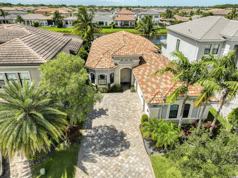 Beautiful and alluring lake views from this upgraded single-story home featuring 4 bedrooms and 3.5 bathrooms, with impact glass throughout. Highlights include coffered ceilings, crown moldings, a custom media center, built-in closets, a full home generator, and whole-house water filtration and purification. The chef's kitchen boasts quartz countertops, a gas range, and premium appliances. The primary suite has custom closets, European-style drapes, and a spa-like bathroom with dual vanities, a large shower, and a bidet. Relax by the heated pool or enjoy the summer kitchen and upgraded picture window screen enclosure. Marble-look tile, an EV car wall charger, and a 3-car garage complete the property. Seven Bridges offers an unparalleled lifestyle with its 30,000 sq ft clubhouse, modern