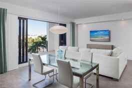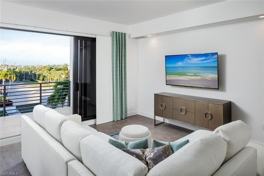 No flooding or major Hurricane Ian damage! AVAILABLE APRIL! Outstanding location in the heart of Naples within walking distance to 5th Avenue S. and close to the beach! Stunning turnkey, fourth floor 2 bedrooms + Den, 2.5 bathroom condominium with 2 garaged parking spaces. Tastefully decorated in soothing modern tones and fabulous split bedroom floor plan with a private lanai and expansive balcony overlooking the pool, bar and lounge. Both bedrooms offer en-suite bathrooms and laundry is in the unit. You'll love the well-appointed kitchen, tile flooring throughout and the abundance of natural light. High-end amenities are a resort-style pool with lap lanes, poolside cabanas and bar, two hot tubs, bocce courts, putting green, grilling areas and fire pits with sitting area, game and billards room, theater, club room and fantastic fitness center. There is a private shuttle service to the beach and evening service to downtown Naples during season.