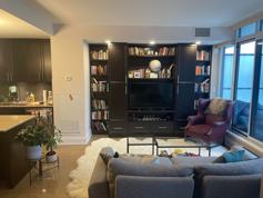 Large main living area with wall unit complete with library, 50-inch flat screen TV with Netflix, Crave, Amazon Prime & HDMI cables.