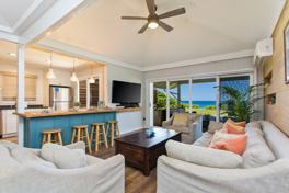 A comfortable sitting area welcomes you as you enter the open concept great room on the main floor, the perfect place to curl up with a book or plan your day with other members of your family who might be seated at the indoor dining table, cooking in the kitchen, or lounging in the living room. The kitchen is updated and spacious, with stainless steel appliances, lots of natural light thanks to the sliding glass doors that open up to the backyard, and a breakfast bar with seating for four. The adjacent living room is bright and beachy, with plush furniture, a flatscreen TV, and pocket doors that frame the incredible view of the lanai, backyard, and bright blue ocean beyond. Enjoy the cool breeze off the ocean as you relax on the covered lanai, grill, or nap in the hammock, hung between two palm trees. A convenient outdoor shower makes it easy to rinse off before settling in for a movie night. The first floor includes three bedrooms, including one with its own private ensuite, one with large windows and an ocean view, and one with bunk beds, great for kids.