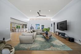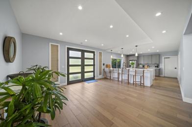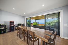 Modern front entry doors lead you into the foyer of Hale Mahina, adjacent to the kitchen with its large breakfast bar that seats four. Custom gray cabinets add warmth to the white countertops and cabinets of the island. A gas stovetop, stainless steel appliances, as well as cookware and utensils ensure you have everything you need for a quick and easy breakfast, or a dinner feast. Three lovely glass pendants, recessed lighting, and sliding glass doors with garden views provide plenty of light when you’re ready to prepare a meal. There is a half bath for guests, conveniently located off the kitchen. The kitchen flows into the living room, which boasts a plush, oversized sectional, modern coffee table, and a large flat screen Smart TV, allowing you to log into streaming services and enjoy family movie nights together. This property does not have air conditioning however it does have ceiling fans to keep the Hawai’ian trade winds blowing. Windows dot the walls at the top of the room, letting in an abundance of natural light. As you move into the dining room, its custom table and chairs are only outshined by the astonishing ocean views that lay beyond the massive sliding glass doors adjoining the space to the front lanai.
