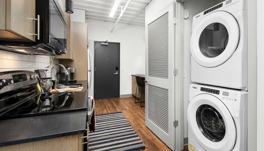 These industrial-inspired apartments feature 9-ft tall ceilings with exposed loft-style structures as well as brick and stone accents. Kitchens have stainless steel appliances, tiled backsplash, stone countertops and sleek cabinetry. Large marble bathroom vanities, wood plank flooring, full-size stackable washers and dryers, and spacious floor plans round out these well-designed luxury units.