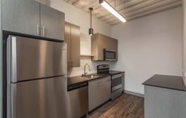 These industrial-inspired apartments feature 9-ft tall ceilings with exposed loft-style structures as well as brick and stone accents. Kitchens have stainless steel appliances, tiled backsplash, stone countertops and sleek cabinetry. Large marble bathroom vanities, wood plank flooring, full-size stackable washers and dryers, and spacious floor plans round out these well-designed luxury units.