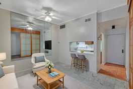 Tons of character and charm in this DC studio (405 sqft) featuring exposed brick, combination of marble tile, hardwood floor and carpet in the unit as well as sliding privacy walls for dedicated sleeping area. Depth is added to the common area with the large wall hung mirror, and boasts a ceiling fan, as well as north facing windows receiving ample natural light. Efficient kitchen comes ready with a breakfast bar, attractive tiled floor, ample cabinet and countertop space. From the foyer, you have a large closet space with built in shelving that leads to bathroom with modern fixtures and vanity.