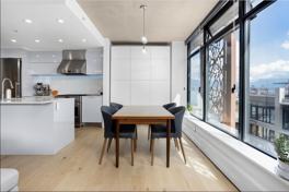 This elegant and impeccable 2 bedroom 2 bath South East corner unit comes with 1 parking stall. The condo has been fully renovated and comes with premium upgrades including white oak engineered hardwood, built-in wardrobe systems, porcelain wall tiled baths, Toto heated washlet toilets, a custom bar with a dual-zone wine fridge, a queen size Italian wall bed surrounded by custom cabinetry in the second bedroom, large den area which can be used as office space, heat-insulating window coverings plus a Miele washer & dryer. The gourmet kitchen has been updated to LED lighting and quartz countertops, a full-size Fulgor Milano dual fuel range & hood fan, Liebherr fridge, & a Miele dishwasher. Enjoy partial ocean inlet & North Shore mountains from your patio.