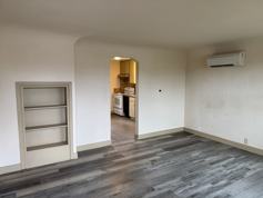 Living room has large windows for great natural light, built in cabinets and arched doorways!