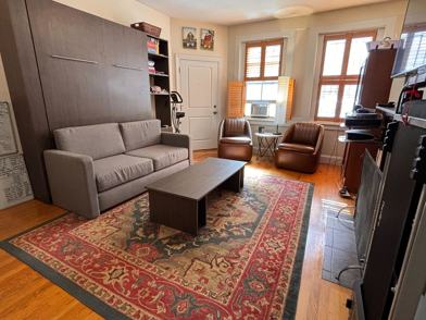 Spacious studio apartment featuring hardwood floors, full kitchen with dishwasher, in-unit washer/dryer, high ceilings, ceiling fan, and private backdoor entrance. Large windows flood the apartment with sun, and a decorative fireplace enhances the cozy ambiance of the space. Pets are welcome, subject to some size restrictions. Apartment can be rented furnished or unfurnished.