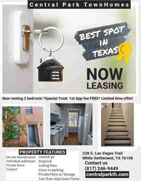Join the happy residents at Central Park townhomes. Spacious floor plans, all appliances included, Fire place, ceiling fans, blinds, two-floor style for that private feeling, individual address, nice-sized yard. W/D connections.