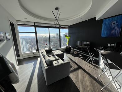 Fully Furnished Penthouse 41st floor no exceptions. 1 bed 1 bath with south facing city Views Woodwards and includes 1 parking spot. No storage locker.