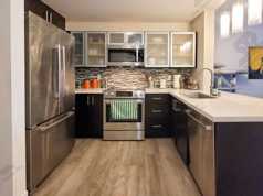This rental comes with quartz countertops, luxury vinyl flooring, refrigerator, range, microwave, dishwasher, full sized washer/dryer, ceiling fans, AC's in the bedroom and living room.