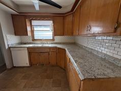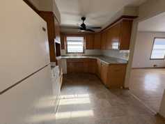The kitchen includes a gas range, refrigerator/freezer, dishwasher, new ceiling fan and updated backsplash tile. There is an eat-in area and the kitchen opens to a large living room with great light and hardwood floors.