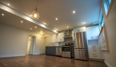 Large bright apt., 1 bedroom, Open concept with modern kitchen in semi-basement duplex with private entrance.