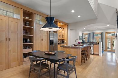 The main level features maple hardwood floors, soaring ceilings, custom millwork, and abundant natural light. A charming foyer opens into a flexible space with a gas fireplace, ideal for a home office, sitting room, or formal dining room. The spacious eat-in kitchen includes granite countertops, custom cabinetry, stainless steel appliances, and plenty of room to cook and gather. The living room, also with a fireplace, flows directly to a private deck and fenced backyard for easy indoor-outdoor living.