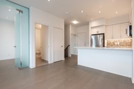 A Unique 3 Br+ Den, Townhome feel. Spread over 2 Floors with multiple South facing balconies and looking across to a secluded courtyard with seating and BBQ. Extremely bright & spacious with loads of upgrades, including two custom frosted floor-to-ceiling glass doors, hardwood floors, quartz kitchen & bath counters.