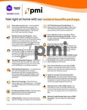 At Pmi, we strive to provide an experience that is cost-effective and convenient. That’s why we provide a Resident Benefits Package (rbp) to address common headaches for our residents. Our program handles insurance, pest control, air filter changes, utility set up, credit building, resident rewards, identity protection and more at a rate of $69.99/month, added to every property as a required program. More details upon application.
