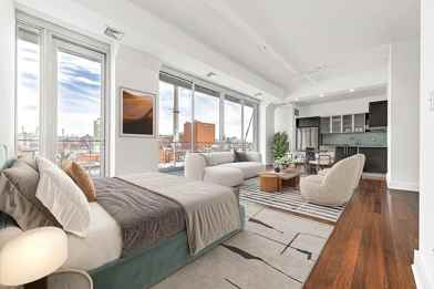 Welcome to 99 Gold, a premier, amenity rich luxury building located where DUMBO meets Vinegar Hill!New to the market is this oversized studio located on the fifth floor with expansive Manhattan skyline views and a spacious private balcony! No broker fee!The Apartment: Each loft-style apartment at 99 Gold Street is thoughtfully designed with a spacious layout and condo quality finishes. With floor to ceiling windows and 12 foot ceilings, light pours into living space and open kitchen, creating a warm and open environment. The kitchens come equipped with marble countertops, and a Bosch stainless steel appliance package, including dishwasher and microwave, as well as a four top range. The open layout offers enough space to comfortably accommodate separate living and sleeping areas. With multiple closets, central heating and air conditioning, and the option of in-unit laundry at no additional cost, weve gone above and beyond to check every box. The Building: Previously a toy factory, 99 Gold is a standout in the area, featuring original details throughout. 99 Gold is home to 87 unique layouts, as well as a plethora of amenities, including a 24-hour door attended lobby, state of the art fitness center with a Peloton bike, Basketball court, Laundry room, Bike parking and a furnished rooftop lounge with sweeping bridge and Manhattan views. Parking and storage also available at an additional cost. The Neighborhood: Located on a scenic tree lined, cobblestone street, 99 Gold is conveniently located where DUMBO meets Vinegar Hill. The neighborhood is famous for its iconic views. From the Brooklyn Bridge views at Main Street Park, to the Manhattan Bridge view on Washington Street, youre constantly reminded of Brooklyns ever-growing history. Spend your weekend afternoons at the Brooklyn Flea, grab lunch at Time Out Market for some of the boroughs best offerings, get a workout in at Brooklyn Bridge Park, and dine in at some of Brooklyns most renowned restaurants, including Vinegar Hill House, Cecconis, Cafe Gitane, The River Cafe and Westville. Just three blocks from the F train at York Street and a short distance to A and C trains at High Street. CitiBike station located outside your front door!Contact us today for a showing!Fees due upon lease signing:First months rent: $4175Security Deposit: $4175Application Fee: $20 per applicant or guarantor