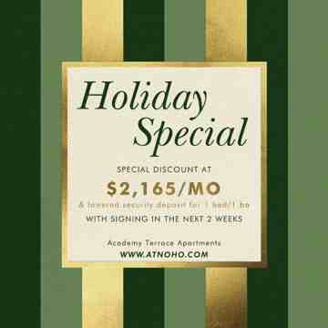 HOLIDAY SPECIAL - For a limited time, secure your new home within 2 weeks and enjoy a reduced rate of $2,165/mo PLUS a lowered $1,000 security deposit with approved credit! A place to call A TRUE HOME. Truly a one of kind jewel in the NoHo Arts District. Welcome home to Academy Terrace (www.atnoho.com). We are now showing a wonderful 1 bedroom apartment for rent in the heart of the NoHo Arts District available now. Large, south facing unit (810-880 sqft) has an open floor plan with a spacious walk-thru kitchen leading to your dining and living area with extended living room nook. Tile floors throughout, wood floor bedrooms. Spacious over-sized closet with sliding mirror doors with built-in shelves. Gorgeous granite counter tops in both kitchen and bath. Extra storage nook in bedroom with granite counter. Double-entry bathroom for privacy with you and your guests. Tiled outdoor balcony perfect for a grill, plants & cozy sitting area. Modern smooth ceilings with beautiful LED recessed lighting throughout for a variety of room lighting atmosphere options with energy efficiency. Lots of cabinet & storage space, extra hall closet. All stainless steel appliances-stove/oven + microwave + dishwasher + garbage disposal. Lots of natural light. Central AC/Heat. Cable-ready. Controlled access. Intercom system. 1 year lease. Rent: $2,165. Deposit: $1,000. PARKING INCLUDED -1 assigned garage parking space included. PET-FRIENDLY - Up to 2 pets allowed with combined weight of 40 lbs and under at maturity. Non-smoking. LAUNDRY-On-site washers/dryers (mobile app and coin operated). UTILITIES INCLUDED - We cover 100% water, gas for hot water, trash, and gardener. NO EXTRA FEES, NO HIDDEN FEES. Shown by appointment only. Call (818) 832-4551 for more information or requests. TTY-711. Equal Housing Opportunity. Prices are subject to change without notice. www atnoho com