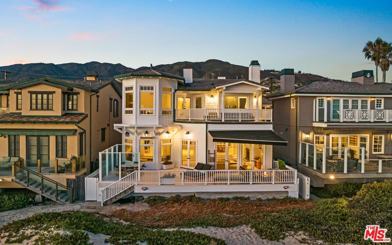 This Cape Cod-style home on Trancas Beach blends Malibu's coastline with effortless, luxurious living. Set on a wide, flat stretch of sandy shoreline, this residence offers expansive ocean views and ample space for indoor-outdoor living and entertaining. A gated entry opens to a charming breezeway, leading to a private courtyard featuring a flagstone fireplace, lounge seating, and a covered Jacuzzi with a waterfall. Freshly updated inside and out, the property includes a two-bedroom, one-bath guesthouse with its own kitchen, gym area, living room with fireplace, and abundant natural light. Accessible either from within the main house or through a separate courtyard entrance, the guesthouse offers privacy and flexibility for visitors or extended stays. The main house showcases light-toned wood floors and ocean views from the moment you step inside. Off the entry, a bonus/media room is equipped with a pool table, Stewart projection screen, en-suite bathroom, and French doors opening to the courtyard. A powder room and laundry room are also conveniently located off the entry hall. The country-style kitchen is the heart of the home, featuring a cozy fireplace, stone countertops, high-end appliances, and ample cabinet space. The kitchen connects to both the family room, which opens to the courtyard, and the living room, where ocean views take center stage. The living room boasts a fireplace and three sets of French doors that lead to a newly renovated, heated beachfront deck. This outdoor space is perfect for dining, lounging, and entertaining, complete with a Weber barbecue, firepit, and steps down to the sandy beach. An additional bar-lounge area enhances the living room's appeal, while the formal dining room, with its fireplace, flatscreen TV, and ocean views, offers a sophisticated setting for meals. A large double-sided fish tank, visible from both the dining room and hallway, adds a unique touch. The upper floor houses three bedrooms, each with balcony access. The primary suite is a luxurious retreat with vaulted ceilings, a fireplace, a sitting area with stunning ocean views, custom closets, a spa-style bath, and an oceanfront balcony with seating. Both the main house and the guesthouse are air-conditioned for comfort. Additional features include an outdoor shower in the side yard, three garages facing the street, and easy access to Trancas Country Market, a short walk away with its shops and dining options. This oceanfront getaway epitomizes Malibu living, with its perfect blend of style, comfort, and breathtaking views. $95,000 per month during the summer months.