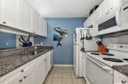 The kitchen has been recently renewed with granite countertops and new white kitchen cabinets.