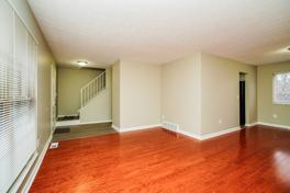 Inside, the main level opens into a spacious living area finished with hardwood flooring, creating warmth and continuity as the space flows toward the dining area. Large windows bring in natural light, while the layout allows each area to feel connected yet clearly defined. The kitchen is positioned just off the main living space and features white cabinetry, laminate countertops, a double-basin sink, and a full appliance package, offering both function and efficiency for daily use.