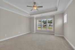 Welcome to luxury living at its finest! This stunning home showcases elegant Luxury Vinyl Plank flooring in the foyer, dining, and living areas, freshly painted interiors, and abundant natural light throughout. The open floor plan is perfect for entertaining, featuring a formal dining room, a spacious living room with a cozy fireplace and vaulted ceilings, and a chef's kitchen with granite countertops in a timeless neutral tone. The kitchen is equipped with a built-in oven and microwave, countertop gas range with a pot filler, light-colored soft-close cabinets, and a pantry. The first-floor owner's suite provides a peaceful retreat with a spa-like bathroom featuring a standing shower, double vanities, water closet, and a large walk-in closet with wood shelving. The main level also includes two additional bedrooms, a secondary full bath, and a convenient laundry room with a utility tub and included washer and dryer.