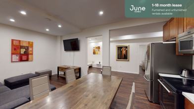 Step through the front door of this three-story Koreatown home and into a lovely second-floor foyer with refinished hardwood floors and high ceilings with exposed joists. The eat-in kitchen on this floor comes equipped with new stainless steel appliances, including two French door refrigerators, and features custom wood cabinets, quartz countertops, and a large breakfast bar. The biggest of the two living rooms is located on the second floor. It offers ample space for chairs, a large coffee table, and sectional sofas. Three bedrooms are on the second floor, one of which boasts a private en suite bathroom. The first floor holds three more bedrooms and a second fully-applianced eat-in kitchen. The open-concept design of the first-floor living area allows you to easily transition from the kitchen table to a comfy spot on a sectional couch where you can enjoy a wall-mounted flat-screen TV. Washers and dryers are located on both the first and second floors. The remaining four bedrooms are on the third floor, three of which offer private bathrooms. All bedrooms can be furnished before moving in and offer spacious closets for storage.
