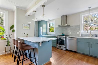 Enter through the front door into the living room. Here you will find a comfortable sofa, large Smart TV, and some additional seating. Just beside the front door is also a small cubby perfect for storing shoes, coats, keys, etc! Just off the living room is the inviting dining room, perfect for family dinners or entertaining! There is a large dining table that seats up to six people. The kitchen is open to the dining room and is well appointed and fully equipped with custom cabinets, high-end appliances, custom hood vent, bar/island with seating, pantry and full sized washer and dryer. The quartz counters, upscale lighting and open shelving make this kitchen a chef's dream.