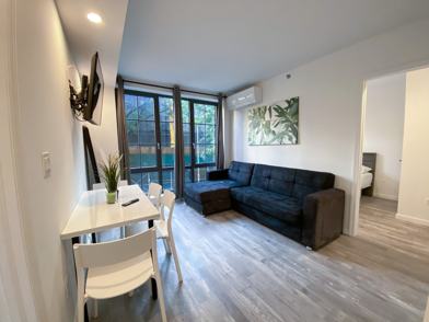 Fully furnished 2br apartment Brand new construction building located in the heart of Midtown West on 53rd and 11th AveThe apartment has been recently renovated and decorated with new furniture. The building is fully wired with elevator, Laundry In Building, Pets Allowed, courtyard Access. Live in a peaceful, quiet building with a vibrant, bustling neighborhood just outside your door. Nearby, there is a quick and easy commute to any Manhattan destination of your choosing. From visiting NYCs hot-spots and shopping for the latest trends, to relaxing with a book at your favorite local cafe This apartment is the perfect space for you to explore and feel at home!THE APARTMENT -Floot to ceiling windows-Queen size bedroom-Stainless steel appliances kitchen-Marble spacious bathroom-Ample closet and storage space- Kitchen is fully equipped- Linen and sheets are provided- Towels are providedNEIGHBORHOODLocated in Midtown West, one of the most convenient neighborhoods in all of Manhattan. Enjoy the beautiful views of the city skyline from the rooftop deck and explore what Manhattan has to offer. Times Square, Columbus Circle, Central Park and the Theater District are all within a short walk. Visit the Intrepid Museum by the pier. The building is also located near every major subway (A, C, E, N, R, 1) and bus lines. BUILDING AMENITIESLaundry in BuildingCourtyardElevatorBroker fee applies