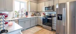 Plenty of closet space, laundry room with washer and dryer. Fully equipped kitchen. Quartz countertops. Open plan kitchen, dinning and living room with fireplace in the second level. Two full bathrooms and three carpeted bedrooms upstairs with their closets. Large double pane windows. Central air and heating. One utility included.