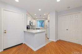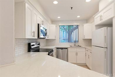 Stunning lower level condo in popular Quail Creek community. This impressive remodeled condo is a true open concept layout. Kitchen remodel is brand new with new shaker white cabinets, marble-like quartz counter tops, subway white tile backslash and a new stainless steel dishwasher, oven and microwave. Includes refrigerator. Bamboo flooring throughout with new carpet in each bedroom. Nice sized living room boasts a newly stone tiled fireplace and glass sliding doors leading to the patio. Bedrooms are on separate wings of the condo for privacy. Master bedroom is large with two closets and a sliding glass door to the patio area. Master has an en suite bathroom newly remodeled with tile shower, frameless glass enclosure, new vanity and a laundry closet including the stackable washer and dryer. Guest bathroom is newly remodeled with a shower/tub combo. Recessed lighting throughout. Oversized patio is enclosed and has a view of the pool area. Includes a covered assigned carport and second assigned parking spot. This community is conveniently located close to freeway and toll road access and an abundance of shops and restaurants are easy to walk to from this location.