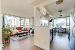 Experience upscale living in this tastefully updated and fully equipped Yaletown penthouse, perched on the 25th floor and featuring two bedrooms and two bathrooms. This spacious 1036-square-foot residence offers a patio measuring 9'1" by 7'2" and showcases incredible views spanning the ocean, mountains, and cityscape. The suite boasts premium fixtures such as a luxurious rain shower, an elegant chef’s kitchen with granite counters, sleek stainless steel appliances—including a wine cooler and a robust hood fan—a wall-mounted TV in the kitchen, a cozy fireplace, and floor-to-ceiling cabinetry. The bright, northwest-facing unit is filled with natural sunlight and includes a dedicated den for office use. The master retreat comes with a king-sized bed and a private ensuite, while the second bath features a contemporary vessel sink. Enjoy the convenience of in-suite laundry, extra storage, secure bicycle parking, and an underground parking spot.