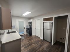 - Bright kitchen with stainless steel appliances including a gas stove, microwave, refrigerator, and dishwasher, plus a laundry closet with hookups for a stackable washer and dryer.