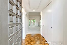 Parquet finished foyer also serves as a service entrance to the galley-style kitchen with quartz countertops and built-in stainless steel appliances. A cheerful breakfast nook for casual meals is also provided.