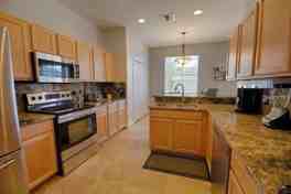 This spacious 6-bedroom, 3-bathroom home features a private pool and spa located within a gated community. The layout includes 2 bedrooms on the main floor and 4 bedrooms upstairs. It also boasts a formal dining room and a large great room with travertine tile flooring. The kitchen is equipped with stainless steel appliances and offers plenty of counter space.