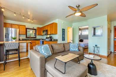As you enter, features an open floor plan with luxury laminate flooring, energy-efficient LED lights throughout, and freshly painted with new window coverings in each room. The floor-to-ceiling sliding glass door to enjoy cool breezes and a peek-a-boo ocean view from your covered private lanai off the main living area. Renovated kitchen with granite countertops, stainless steel refrigerator, appliances that include a glass top range/oven, dishwasher, and microwave. Renovated bathroom with a walk-in shower and a two-door entry. The bedroom has a comfortable King-size bed with linens, a Smart flat-screen T.V., and an air conditioner for extra comfort. For added convenience, a Full-size Washer/ Dryer in the unit, Basic Cable is included, as well as an Assigned Parking Space and Mailbox.