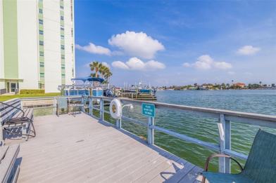 Lovely guard gated FURNISHED highrise condo unit with water views. This open concept condo features 1 bedrooms, 1.5 bathrooms, a walk in closet, open concept kitchen and 1 assigned parking space. located at the lovely community of Three Palms Pointe in St Pete Beach, the community amenities include a beautiful pool that overlooks the inter-coastal, fitness center, community lounge and library, a social room with billiards and other games, fishing dock and so much more. This is a wonderful place to call home and only minutes to walk to the beach and tons of restaurants and shopping close by.