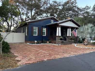 "Blue Bungalow"- Newer construction, blending coastal charm with craftsman detail. Downtown Dunedin furnished winter rental, just 2 short blocks from the Blue Jays Stadium & Pinellas Bike Trail! Modern rustic cottage- cathedral wood beamed ceilings throughout, modern kitchen w/breakfast island and coffee bar. Master suite offers king-size bed, walk-in closet, private bath with shower; queen bed and built-ins in BR#2! Laundry room with full-size w/d. AND-enjoy outdoor living at its finest, pavered back patio with covered gazebo featuring lighting, fan and TV, BBQ grill and firepit! Bring your toys! Covered parking for your golf cart, kayaks or bikes and a 40 ft fenced backyard parking pad for your RV or boat with 50amp power service, water and sewer hookup! Enclosed outdoor shower with H/C water.