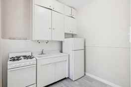 Functional kitchen with gas stove, refrigerator, and ample cabinet space