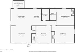 Three bedrooms extend along a quiet hallway, each offering comfortable space and ample storage. The bathrooms include tasteful tilework, with one featuring a soaking tub and the other a walk-in shower, providing both comfort and practicality. A dedicated laundry room just off the dining area adds convenience without interrupting the home’s flow.