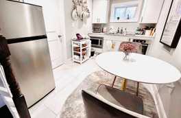 This fresh, airy, 1 bedroom in-law apartment unit features a living room, kitchen, bathroom, and bedroom, and washer/dryer. Living room includes a flat screen TV connected to Wifi. The unit is fully furnished and includes everything you'll need to prepare your meals. The small but stocked kitchen includes a fridge, stove, oven, sink, microwave, pots/pans, dishes, utensils, etc. Cleaning, wifi, and utilities are included in the price. The gorgeous yard has a fire pit, aridondack chairs, & dining table.