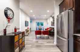 Open-concept living area with quartz countertops, stainless steel appliances, and a walk-in pantry